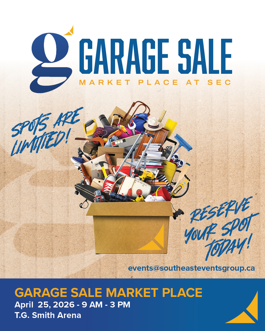 We are excited to invite you to grab your spot at the Garage Sale Marketplace at SEC which will be held, as usual, in the T.G. Smith Arena.