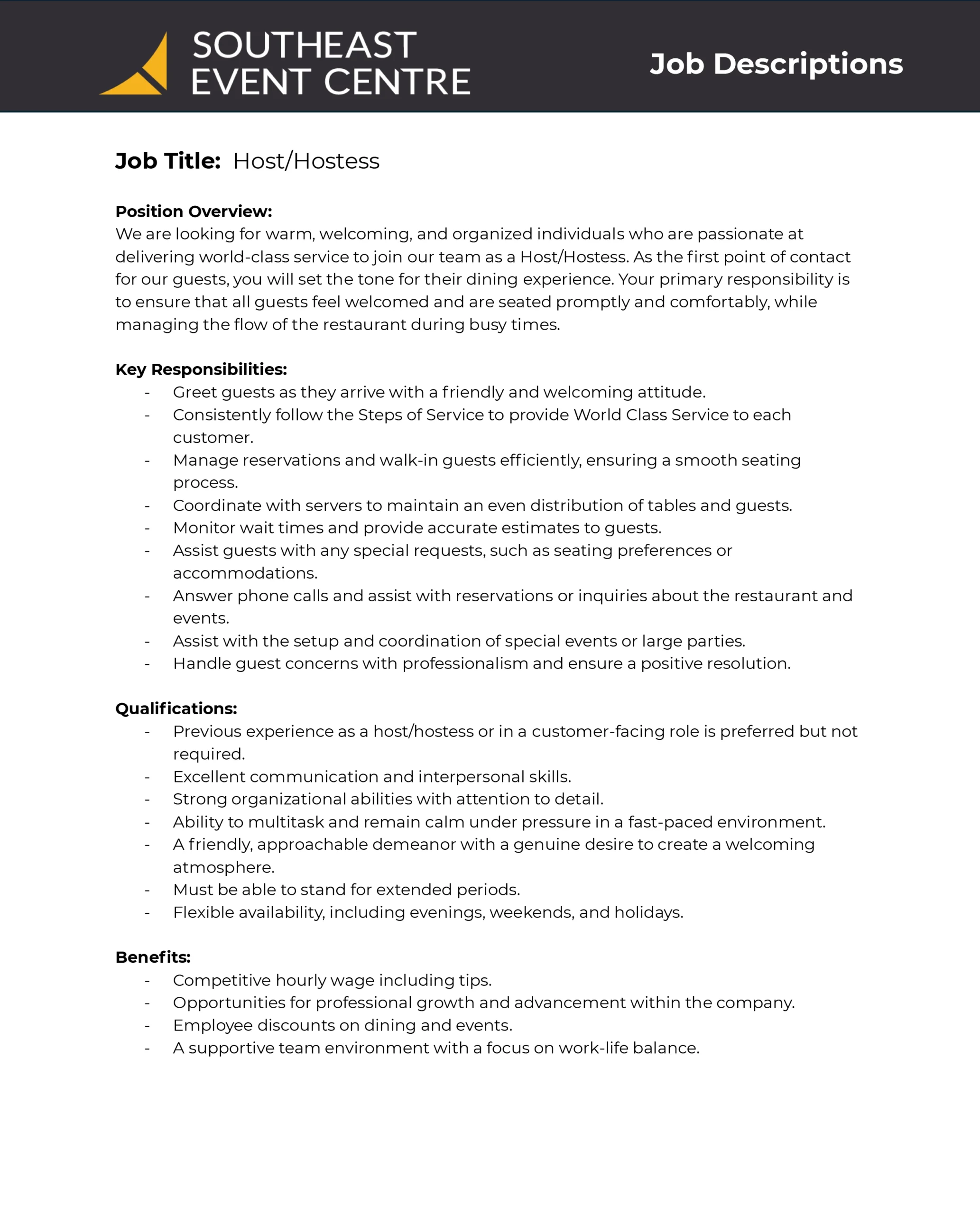 Job Opening: Host/Hostess